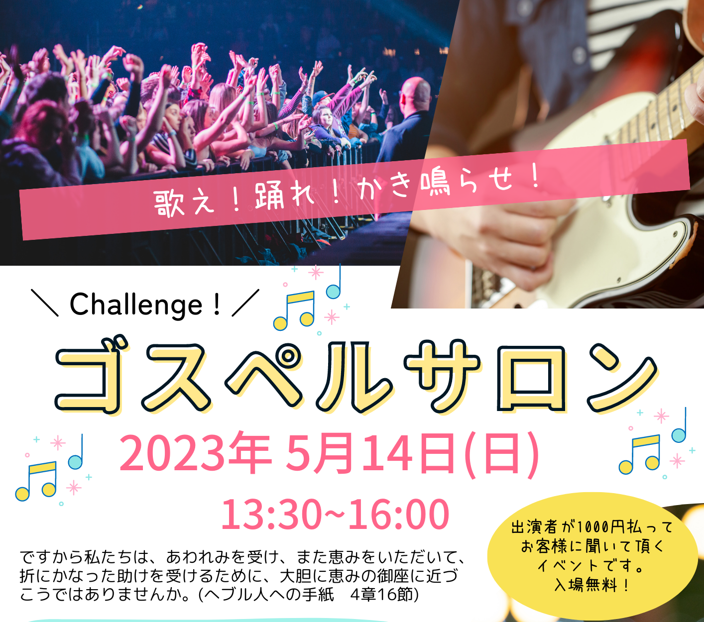 来る2023年5月14日(日)岡崎ホープチャペルにて「ゴスペルサロン5/14」を開催いたします。「ゴスペルサロン3/26」に引き続き2023年2回目となるイベントのテーマは「チャレンジ!」。参加者や出演者の皆さんがチャレンジ精神を持って恐れず歩むことが出来ますように、という思いをもって開催します。皆様お誘いあわせの上ご参加ください。