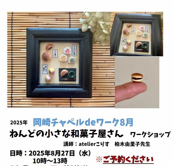 チャペルdeワーク2025年8月は「ねんどの小さな和菓子屋さん」ワークショップです。カフェ&ランチつき!どなたでもお気軽にご参加ください。