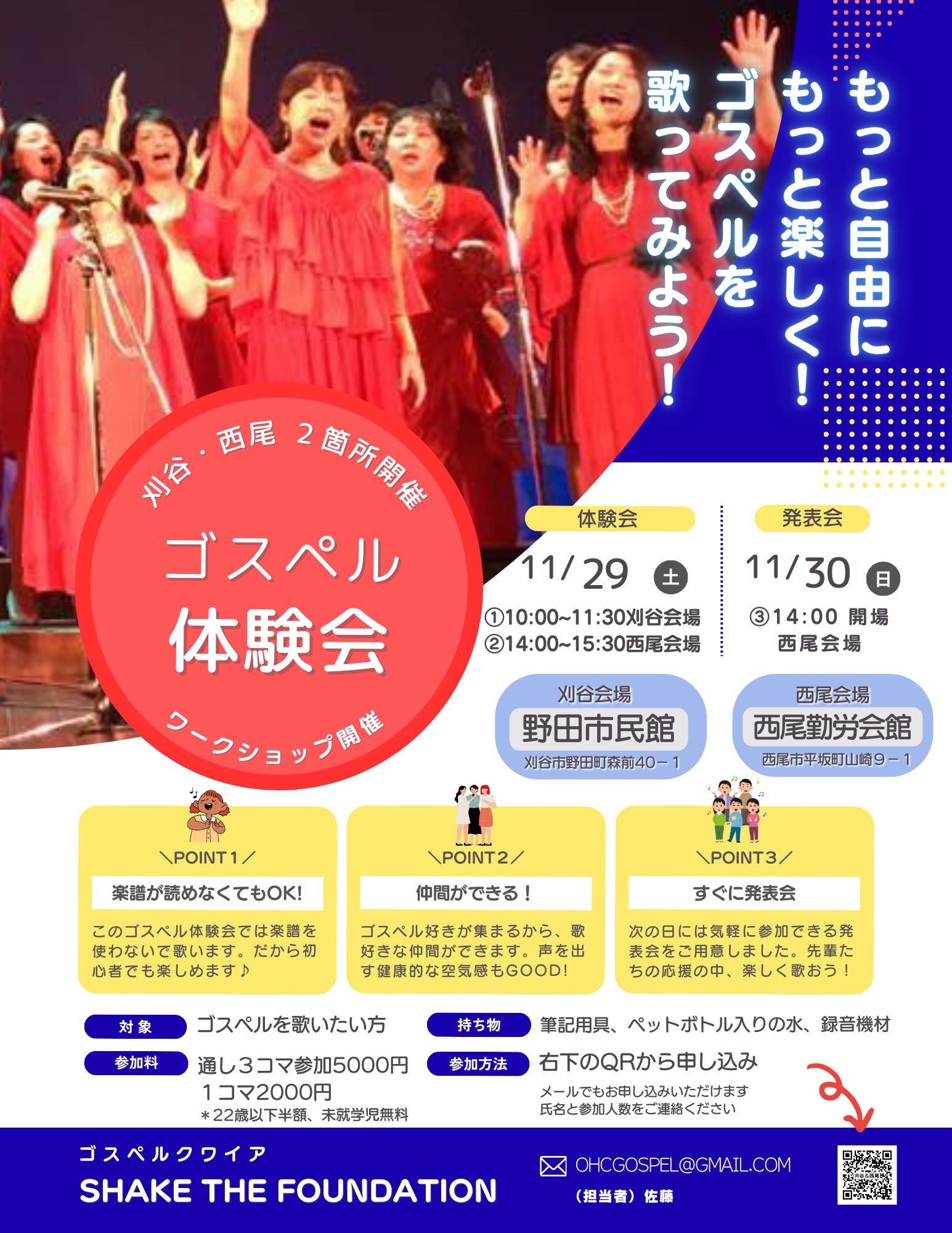 来る2025年11月29日(土)~30日(日)愛知県刈谷市と西尾市にてゴスペル体験会・発表会が開催されます。皆様お誘いあわせの上申込フォームよりお申し込みください。