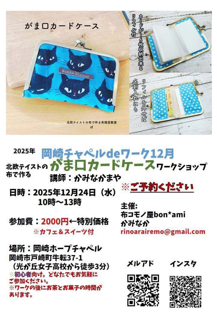 チャペルdeワーク2025年12月は北欧テイストの布でつくる「がま口カードケース」ワークショップです。カフェ&スイーツつき!どなたでもお気軽にご参加ください。