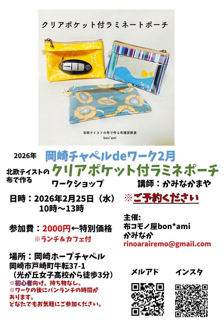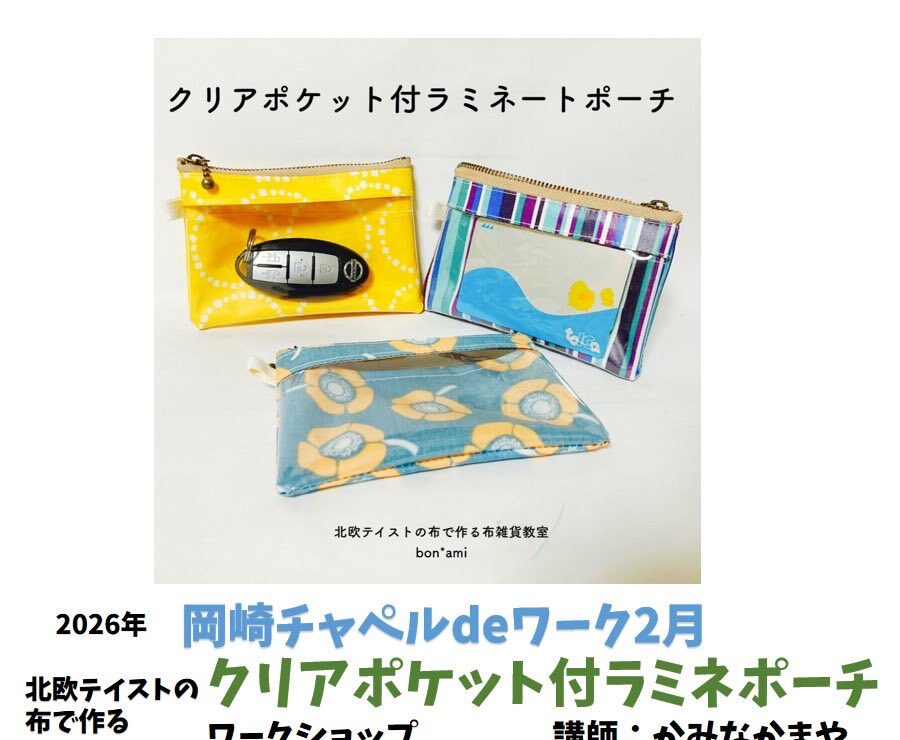 チャペルdeワーク2026年2月は北欧テイストの布でつくる「クリアポケット付きラミネートポーチ」ワークショップです。ランチ&カフェつき!どなたでもお気軽にご参加ください。