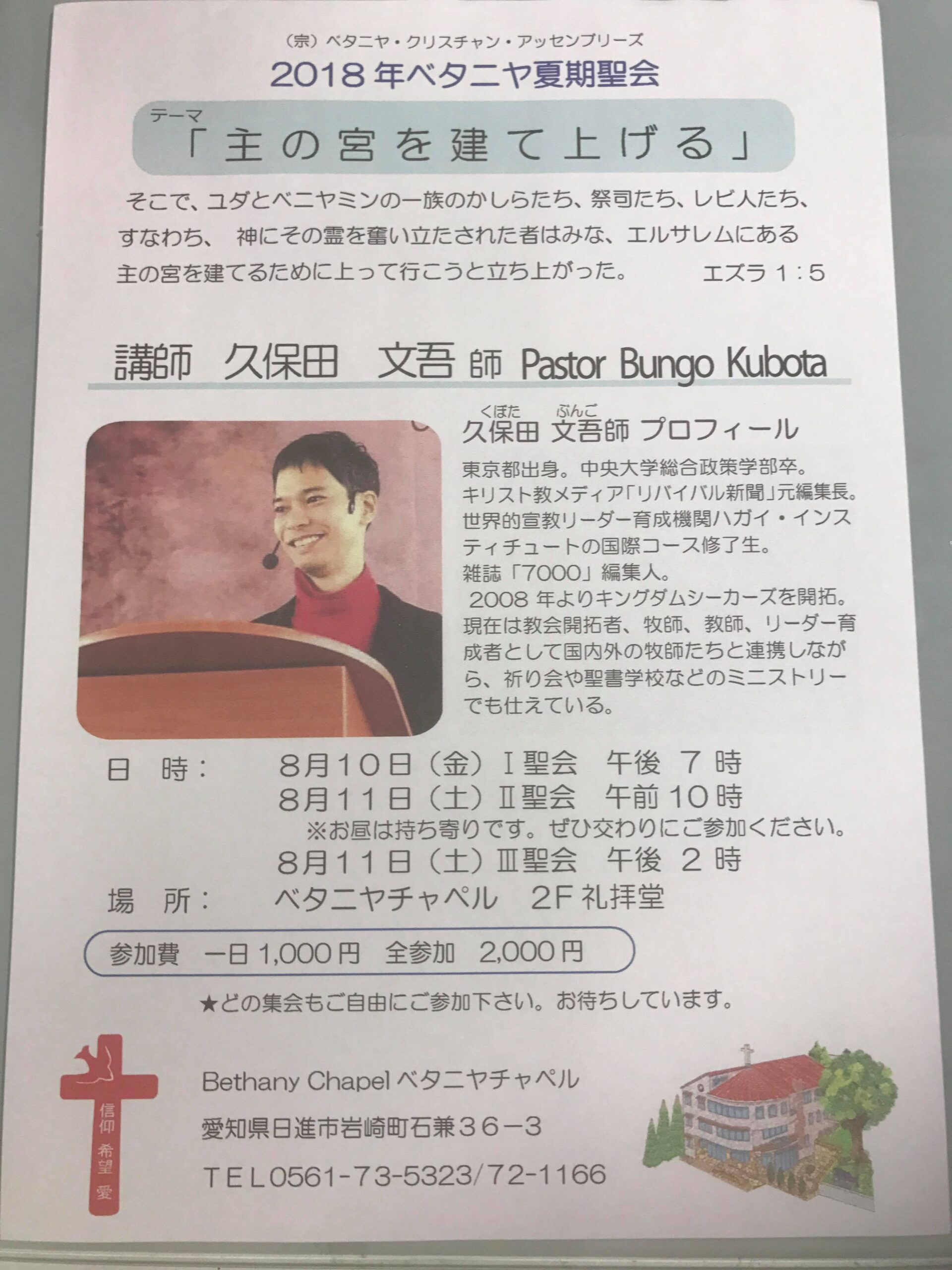 8月10日(金)・11日(土)ベタニヤチャペル夏季聖会にて久保田文吾 師がメッセージされます
